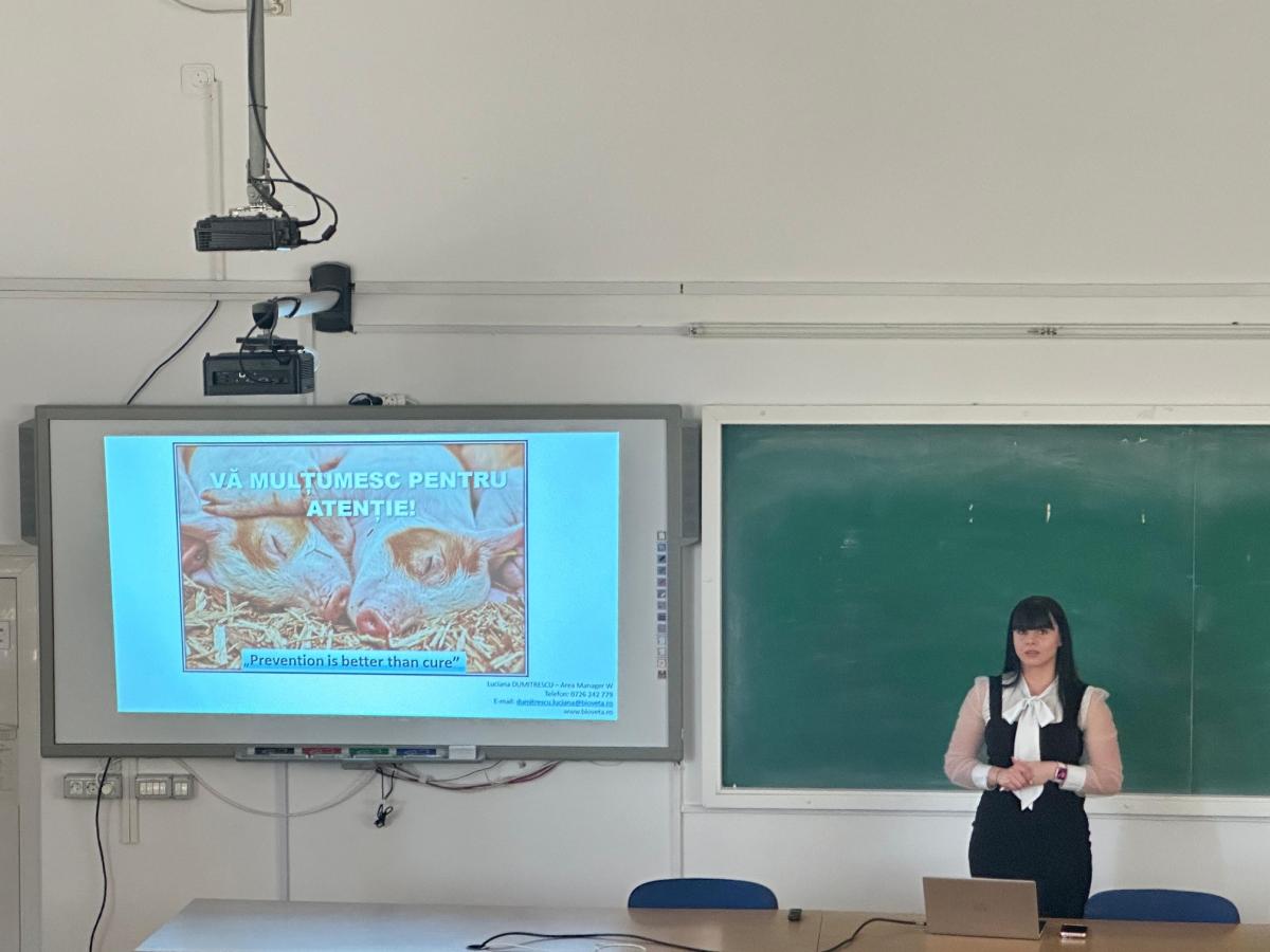 Astăzi, 10.04.2024, noi, Compania BIOVETA ROMÂNIA prin reprezentantul zonal, am avut deosebita plăcere să îi invităm pe studenții din anul terminal la Simpozionul organizat împreună cu Facultatea de Medicină Veterinară din Timișoara, unde am dezbătut următorul subiect de interes: “MANAGEMENTUL BOLILOR SUINELOR – NOILE TENDINȚE ÎN PROFILAXIA SPECIFICĂ” includ introducerea a doua noi produse Biosuis ParvoEry L(7) si Ketoprofen Bioveta 100 mg/ml.