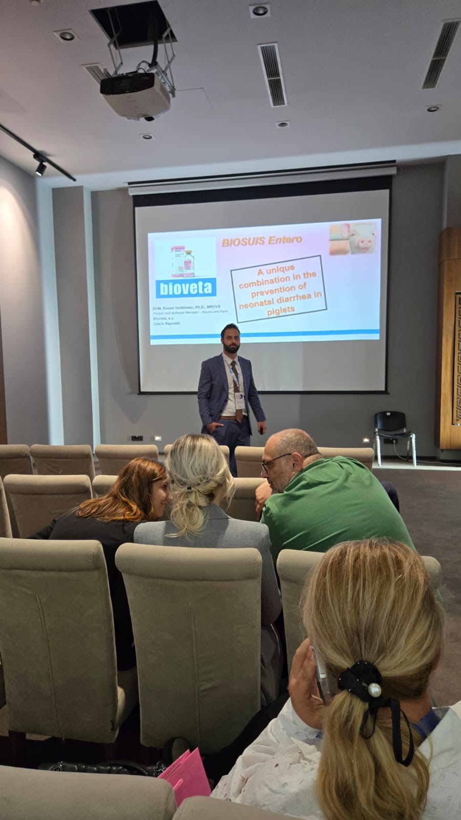 DVM. Ronen Hoikhman, Ph.D., MRCVS, Product Manager, a prezentat solutia cea mai eficientă sub aspect practic, utilizarea vaccinului polivalent cu compoziție unică, Biosuis Entero, care reușește prin imunizarea scroafelor in ultima perioadă a gestației să transmită un titru suficient de anticorpi, astfel încât să reducă atât aparița diareilor neonatale dar și presiunea infecțioasă din efectivul matcă.