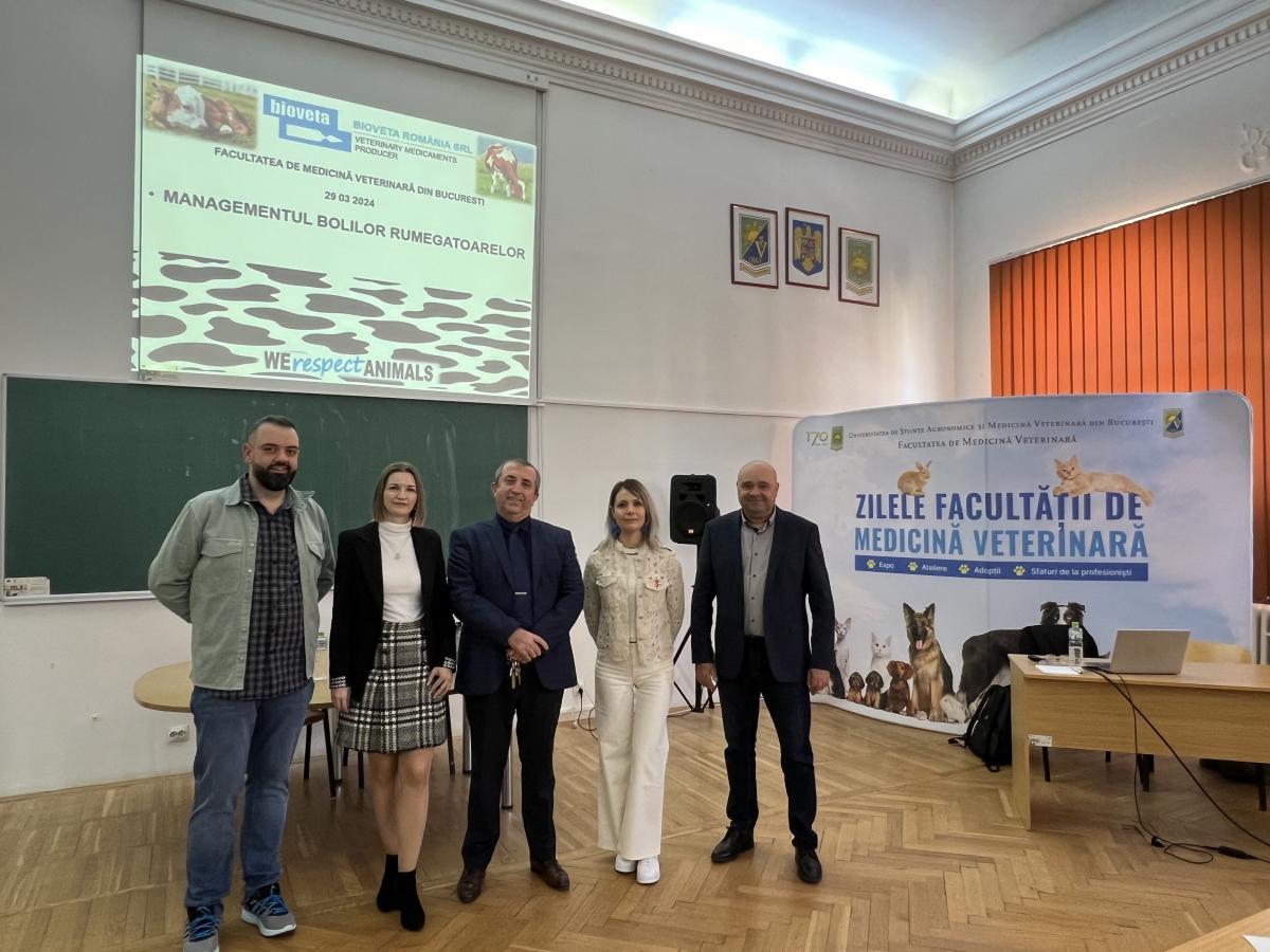 Simpozionul cu tema ,,NOI ABORDĂRI CLINICO - TERAPEUTICE ÎN MANAGEMENTUL BOLILOR LA ANIMALELE DE RENTĂ’’, București 29.3.2024 Continuând tradiția anilor anteriori, firma Bioveta România se implică activ în pregătirea studenților din cadrul Facultăților de Medicină Veterinară din România. În data de 29 03 2024, am avut prilejul de a fi prezenți în Facultatea de Medicină Veterinară din București la Simpozionul cu tema ,,NOI ABORDĂRI CLINICO - TERAPEUTICE ÎN MANAGEMENTUL BOLILOR LA ANIMALELE DE RENTĂ’’ . La eveniment au participat studenții anului VI cursanți ai modulului masteral ANIMALE DE RENTĂ, de la disciplinele masterale Managementul Bolilor Suinelor având drept coordonator Șef de lucrări Doctor Valerica Constantinescu și Managementul Bolilor Rumegătoarelor, coordonator fiind Șef de lucrări Doctor Alexandru Duțulescu.
