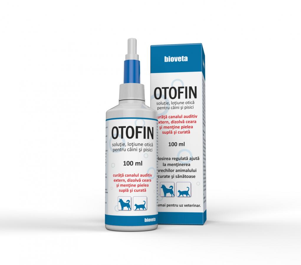 - Otofin loţiune otică pentru câini şi pisici curăţă canalul auditiv extern, dizolvă ceara şi menţine pielea suplă şi curată. Folosirea regulată ajută la menţinerea urechilor animalului curate şi sănătoase. Muşeţelul, lavanda, busuiocul şi propilenglicolul sunt recunoscute pentru capacitatea de a reduce numărul bacterillor şi ciupercilor, ele acţionând, de asemenea, şi împotriva unor viruşi şi acarieni. Muşeţelul şi alfa-bisabololul au o acţiune dovedită antiinflamatoare şi un efect calmant.